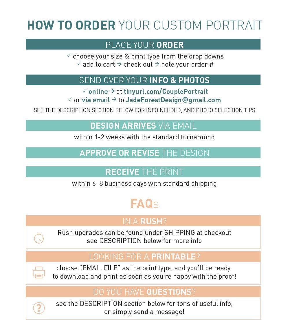 We usually ask you to provide your info in the "Personalization" or "Notes" box when placing you order. For PORTRAITS, each design has a unique web link for sending over your photos.