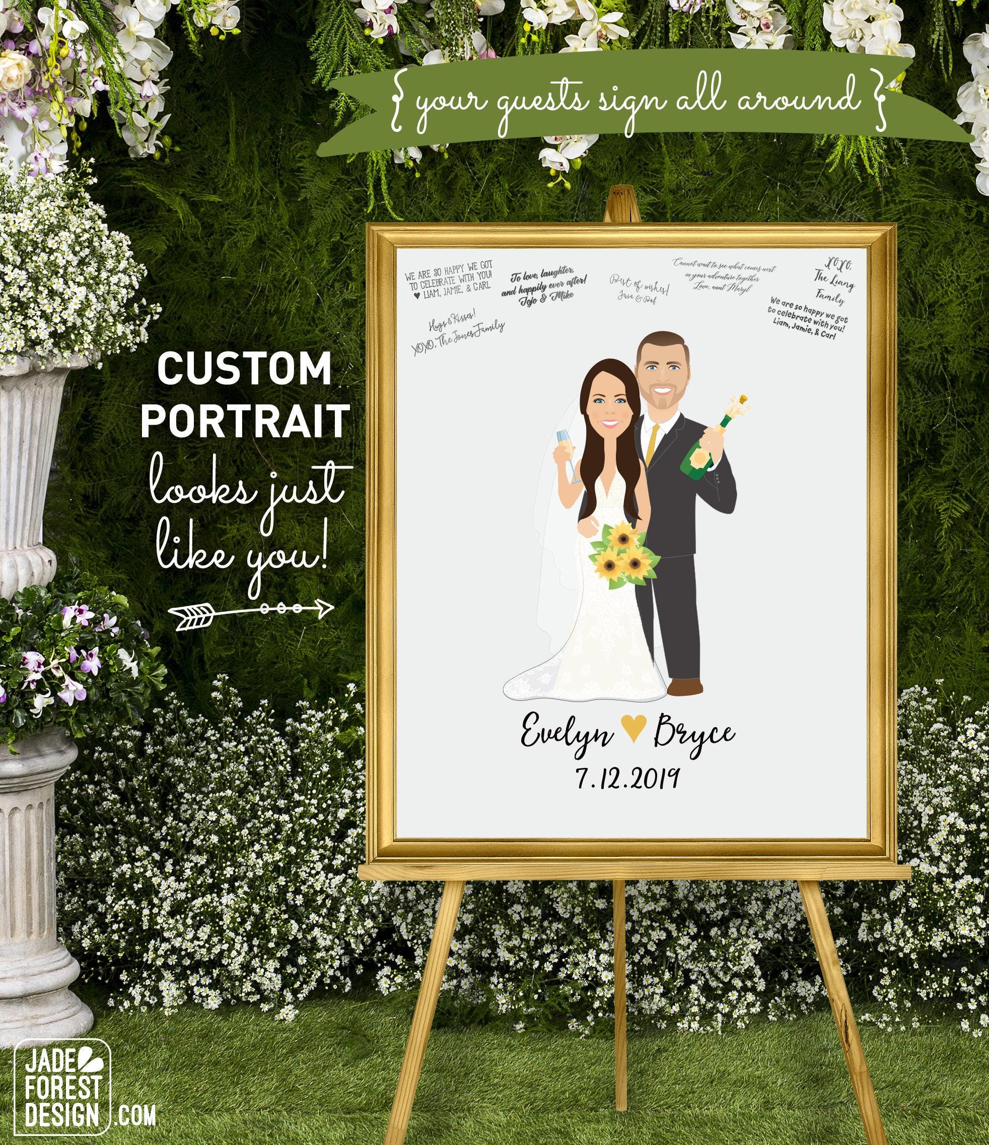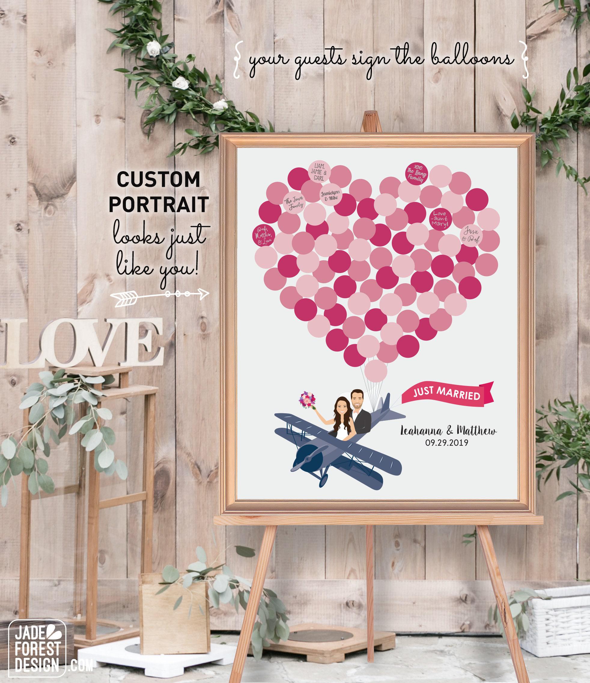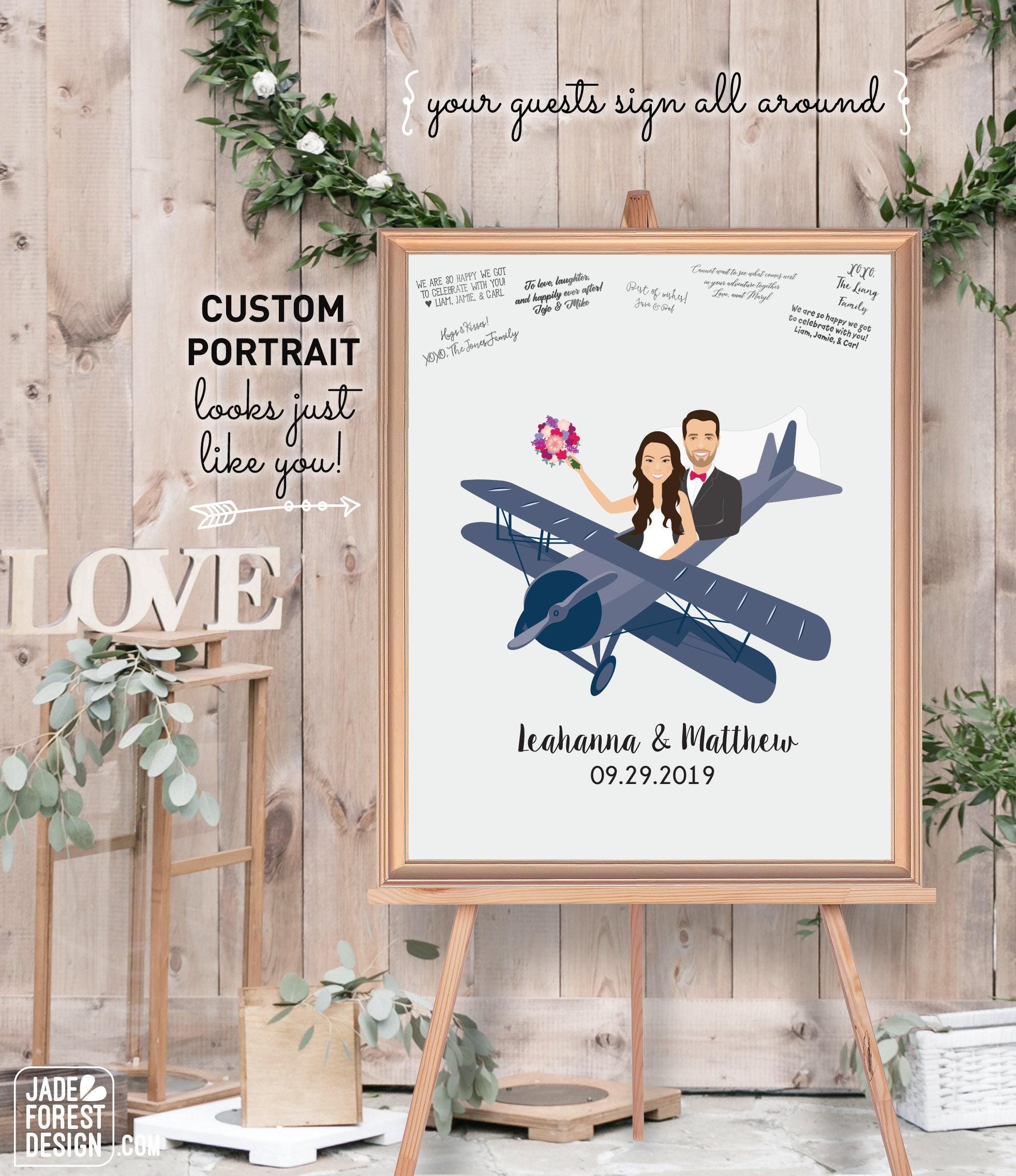 Celebrate your special day with a unique wedding guest book that doubles as a cherished keepsake. This personalized couple portrait guest book offers a delightful alternative to traditional designs, inviting guests to sign around a charming cartoon illustration of the bride and airplane pilot groom. Featuring custom details and crafted with care, this framed guestbook is perfect for couples seeking a fun, meaningful way to capture memories.