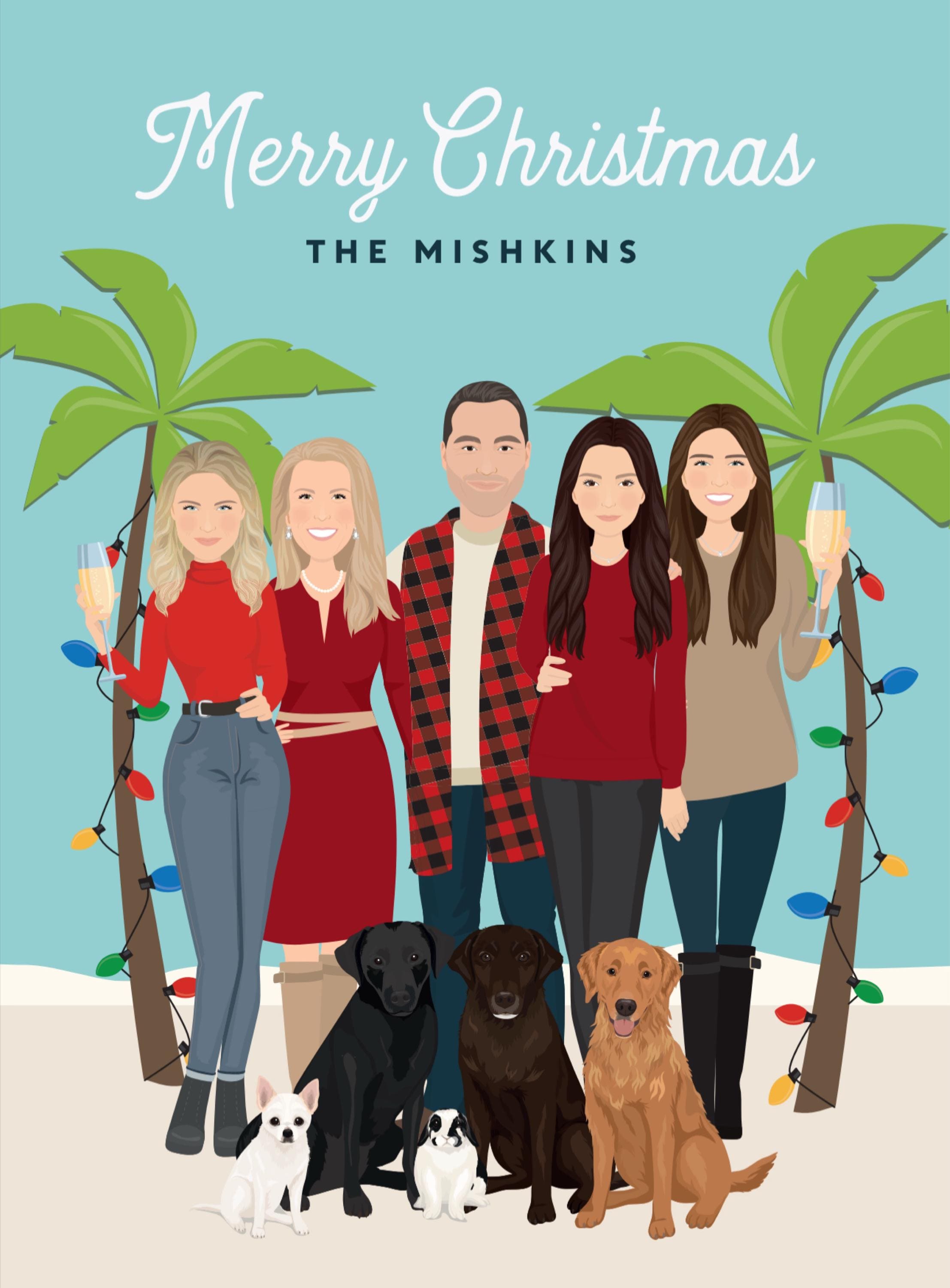 This CUSTOM PORTRAIT holiday card is sure to be a hit with everyone on your list! It features a custom cartoon illustration of your family and pets, created from your photos and description. The artwork will be completely customized to look just like you, including hairstyles, clothing, accessories! This fun and unique Christmas card will be cherished by all who receive it.