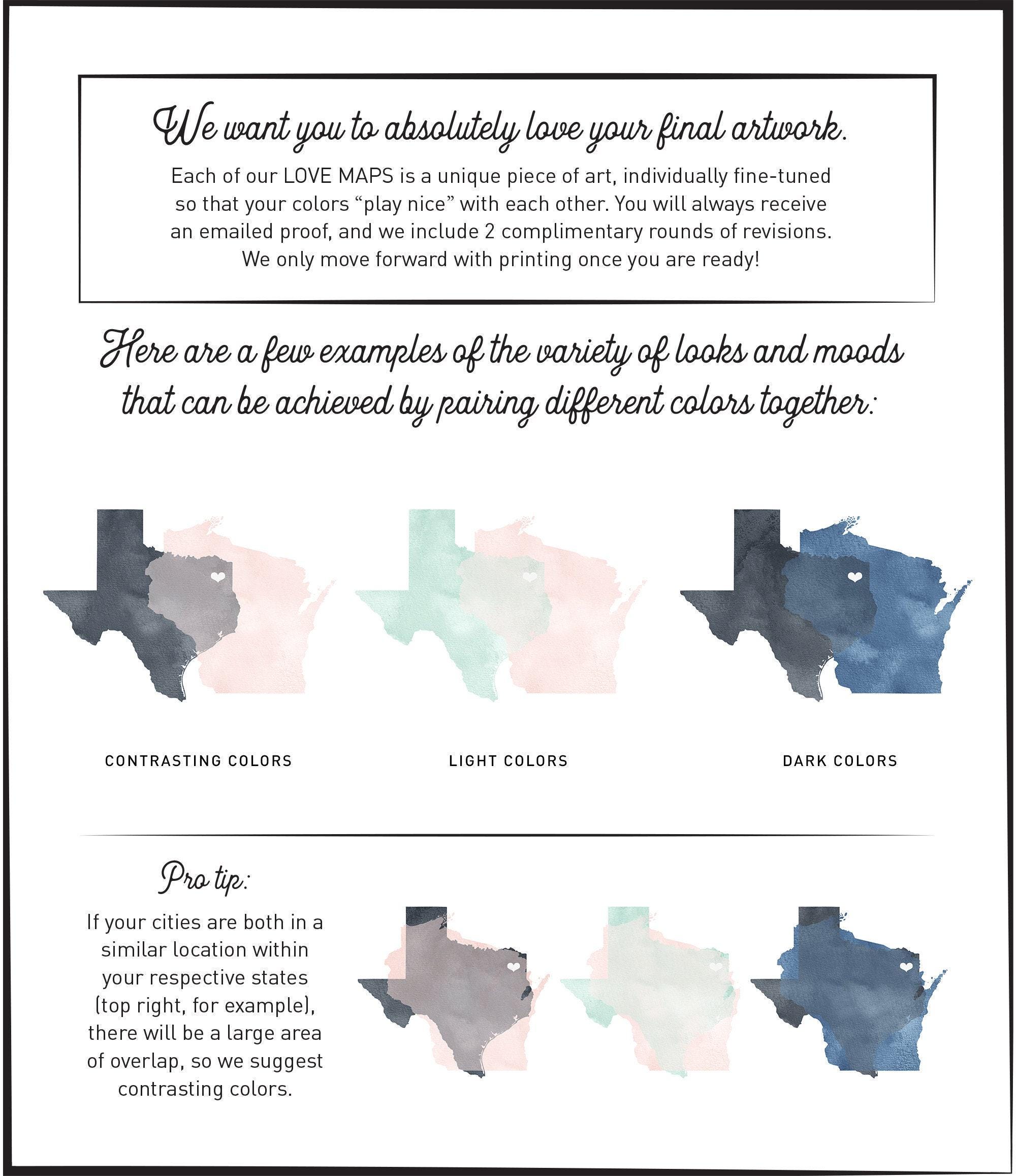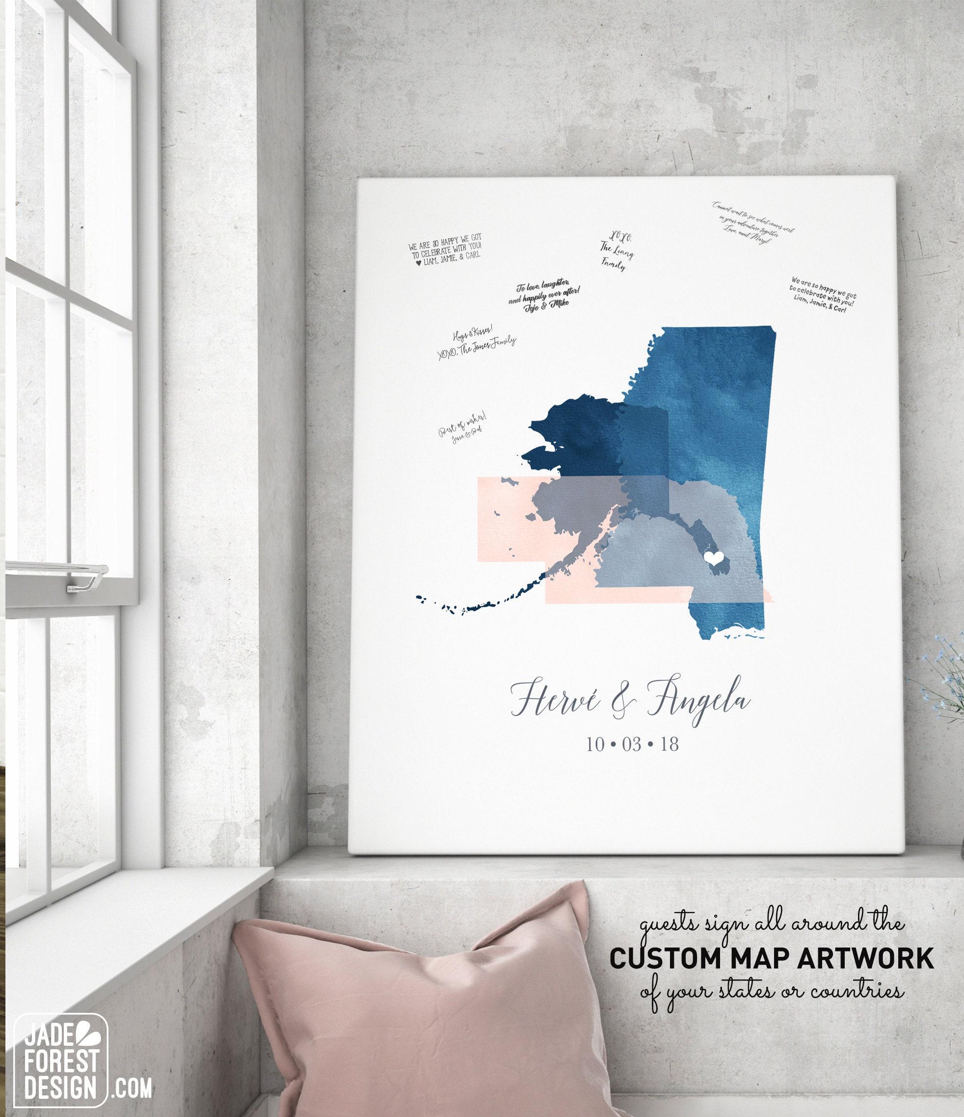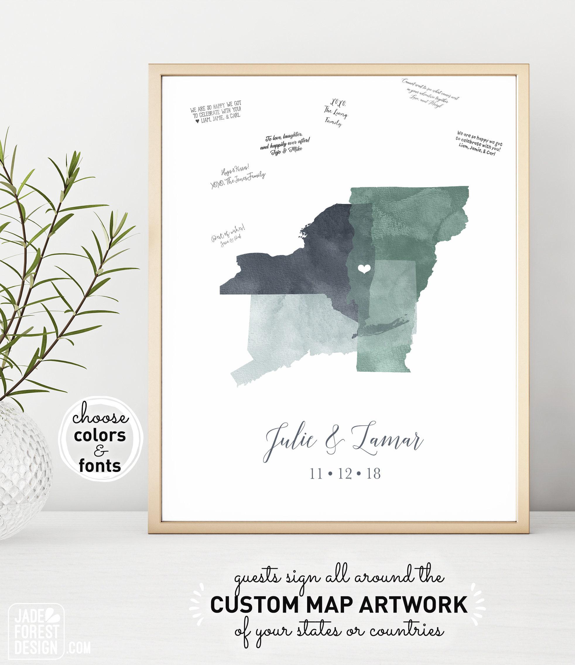 Our CUSTOM LOVE MAP guest book will tell your unique love story. It features your choice of states or countries, done in a beautiful watercolor effect, overlapping and marked with a heart over the intersection of the three cities. The artwork will be completely customized with your locations and colors.
