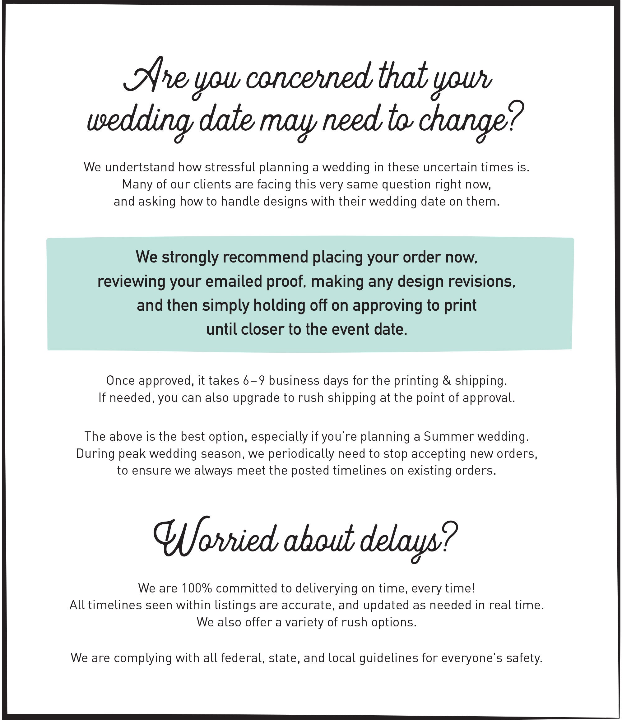 You may also choose to rush the printing & shipping portion of the process only. A link to shipping upgrade options will be included in the email you receive with your proof.