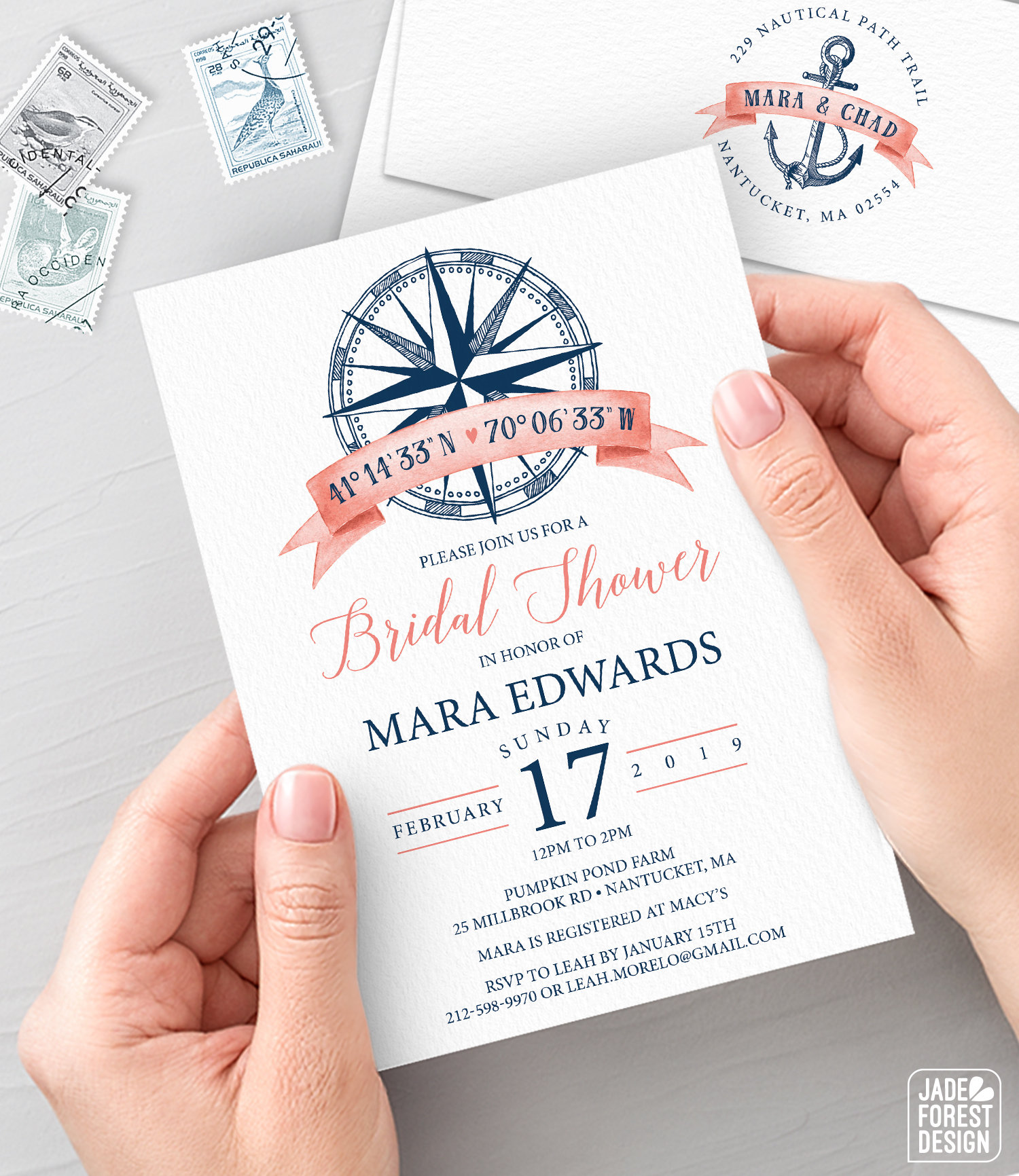 The NAUTICAL COORDINATES collection features vintage-inspired maritime illustrations in a classically elegant navy and white color palette, accented with a vibrant, beachy coral, and your personalized location coordinates. Keep the trendy color theme, or customize with your colors!