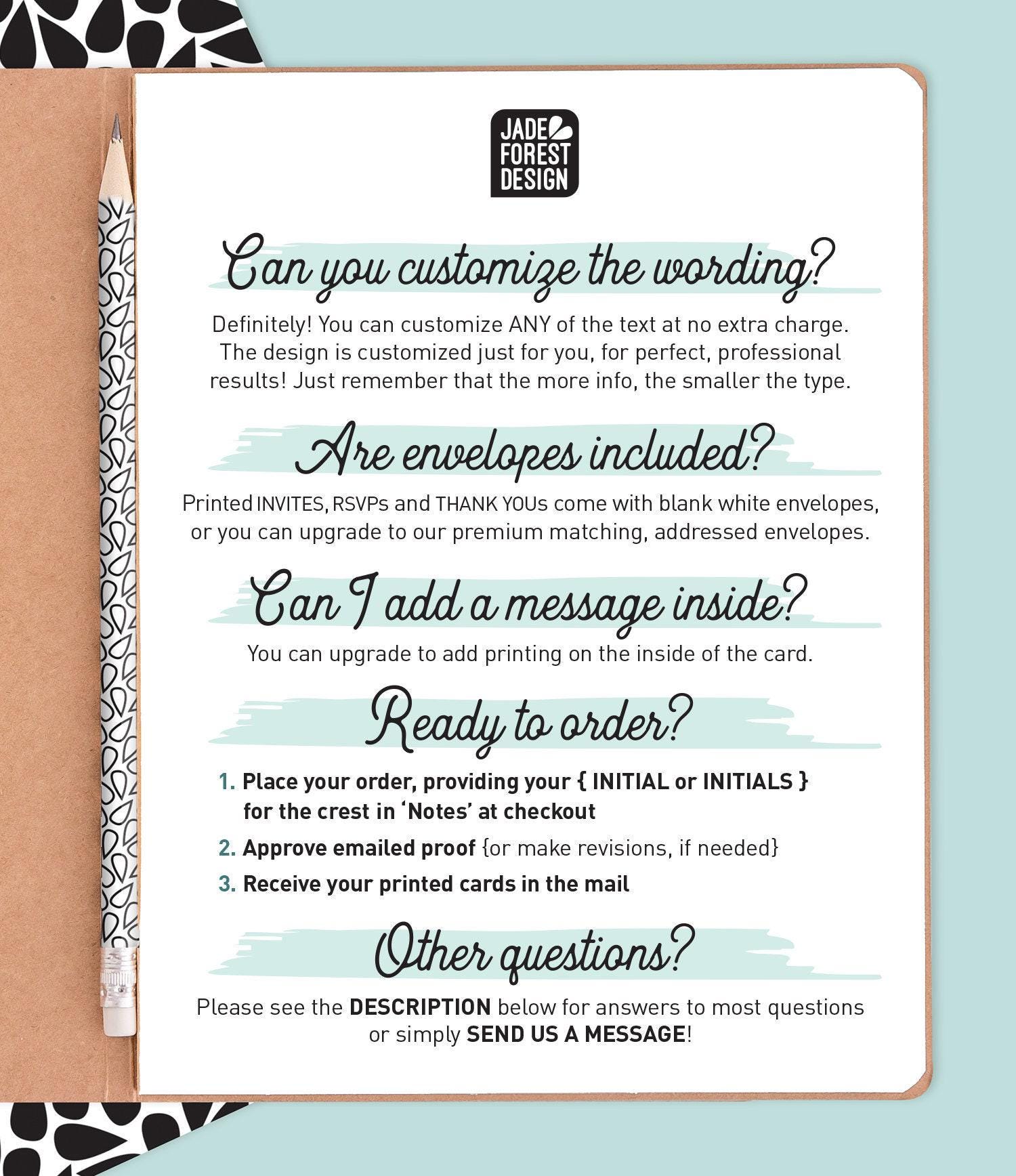 BLANK WHITE ENVELOPES are included with all printed invites, RSVPs & thank you cards.