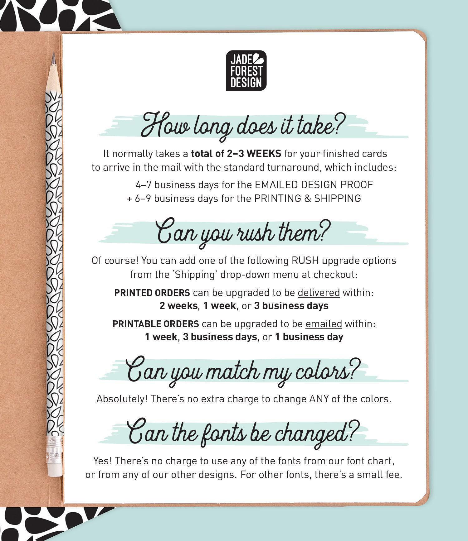 Printing and shipping takes approximately 2–3 weeks from proof approval. For PRINTABLE orders, you will be able to download and print as soon as you're happy with the emailed design.