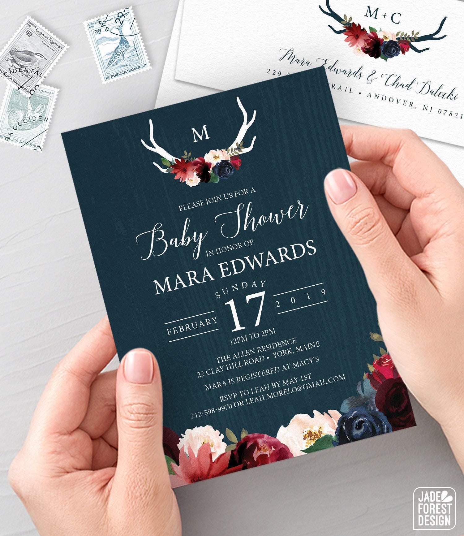 The RUSTIC BURGUNDY NAVY collection features lush marsala, burgundy and blush watercolor blooms, on a distressed barn wood background, crowned with your initials in a boho deer antler crest. Keep the trendy color theme, or customize with your colors!
