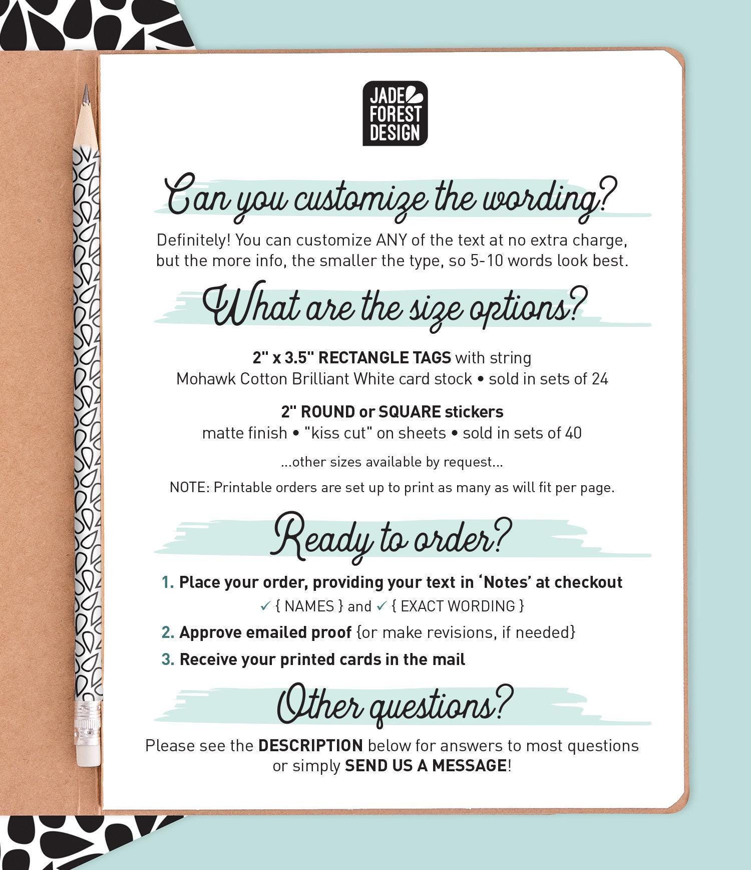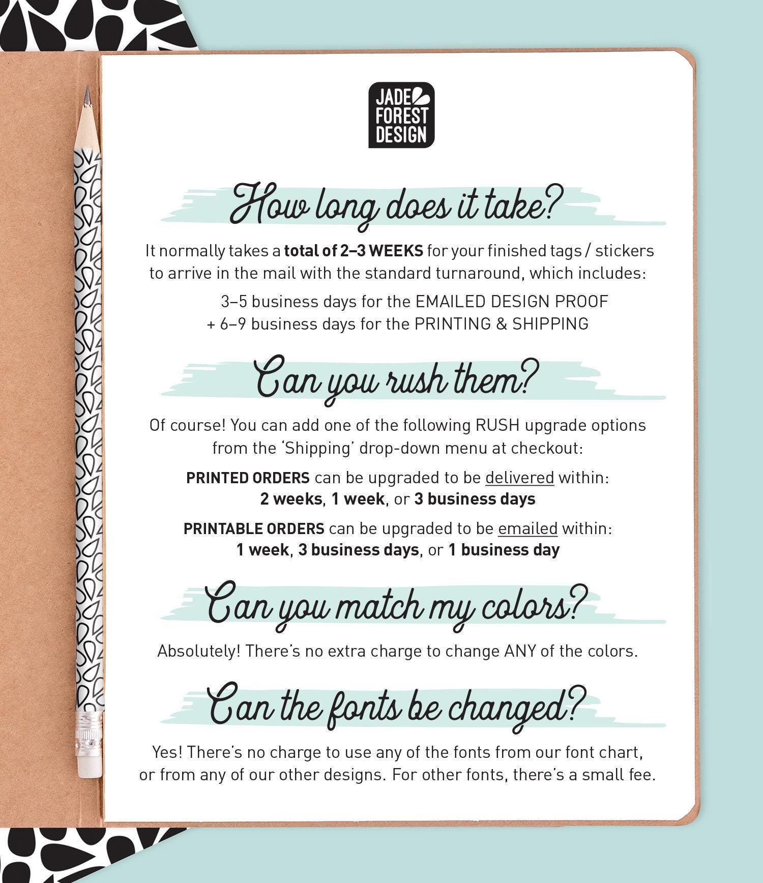 4️⃣ Your tags or stickers will be printed and shipped once you approve the emailed design. You can expect to receive them in 10–13 business days. RUSH options below ↓