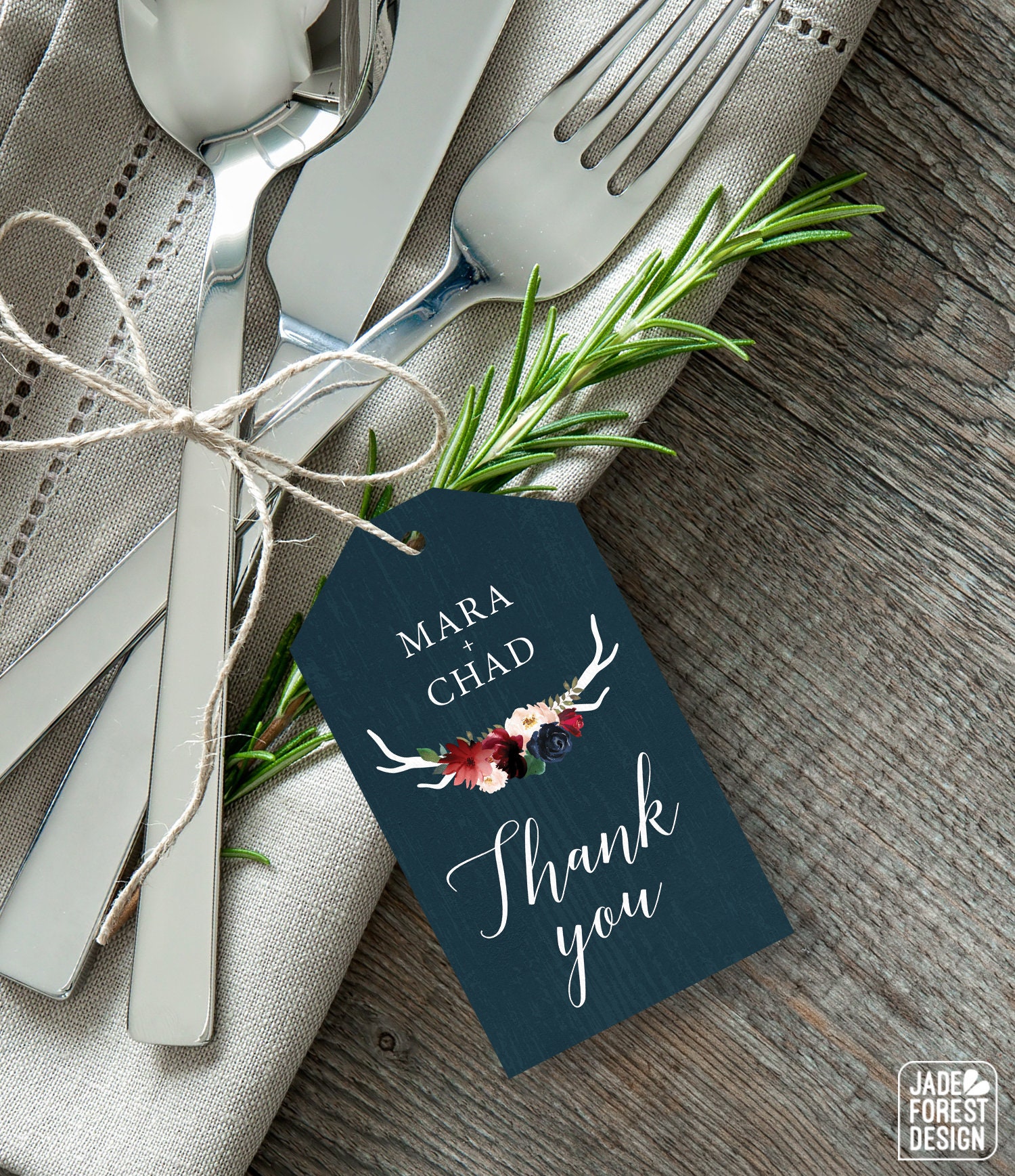 The RUSTIC BURGUNDY NAVY collection features lush marsala, burgundy and blush watercolor blooms, on a distressed barn wood background, crowned with a boho deer antler crest. Keep the trendy color theme, or customize with your colors!