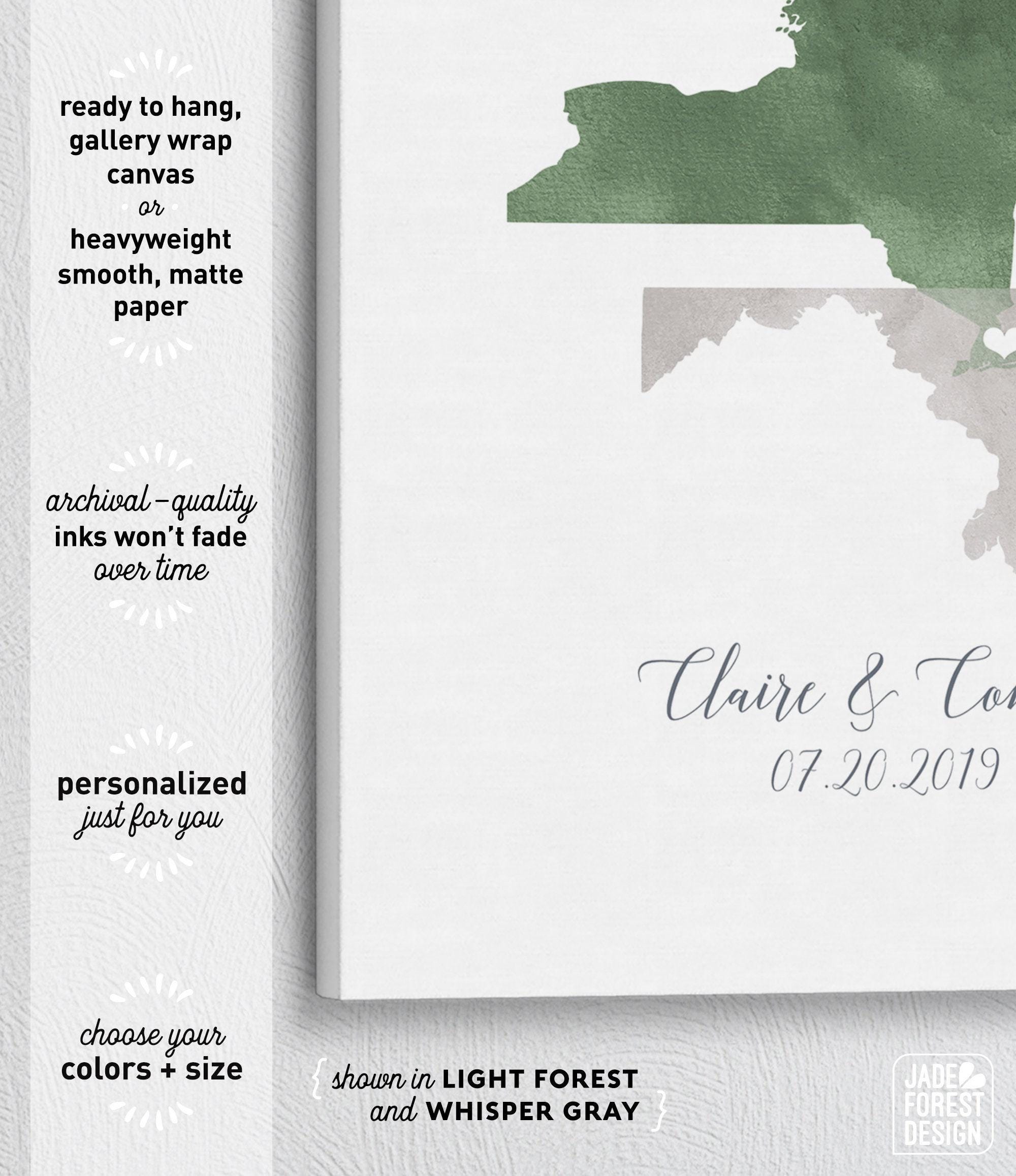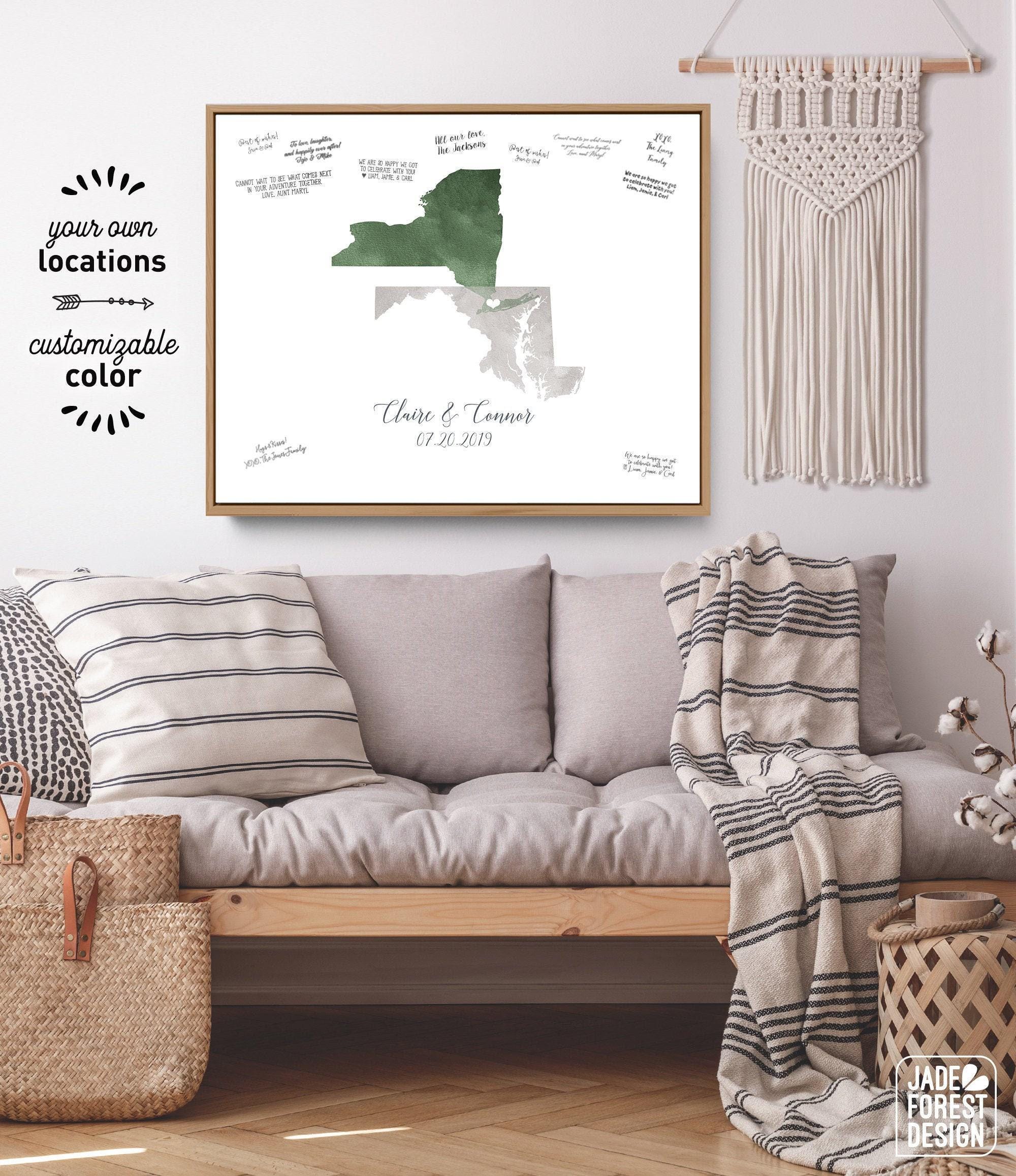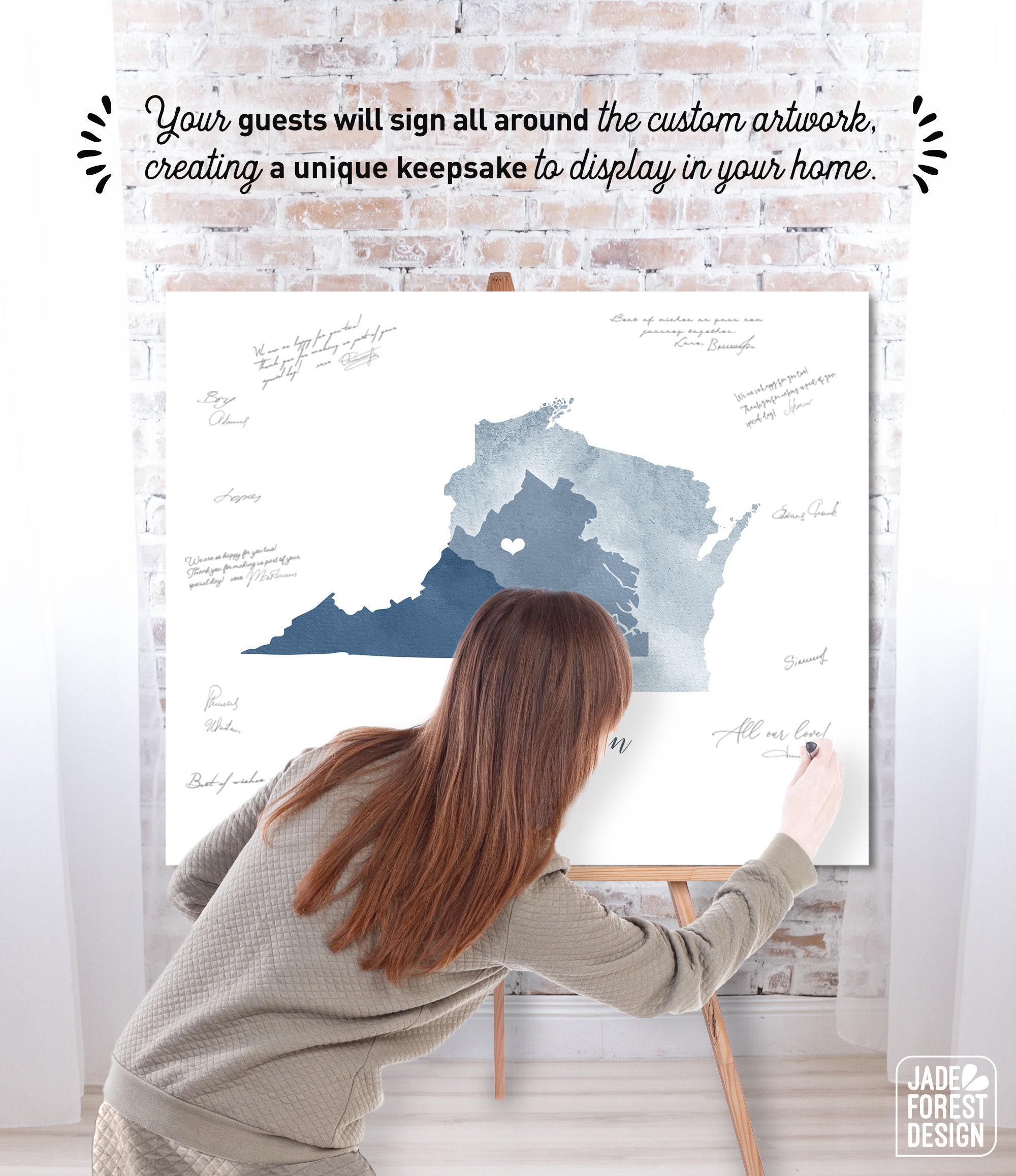 Celebrate your unique love story with a personalized guest book alternative that beautifully combines watercolor state art and custom keepsake sign elements. This wedding guest book transforms your special day into a lasting memory, inviting guests to sign around a stunning map highlighting your two home states. Designed as an XL framed guestbook, it offers a meaningful and artistic way to capture well-wishes while doubling as elegant wall decor.
