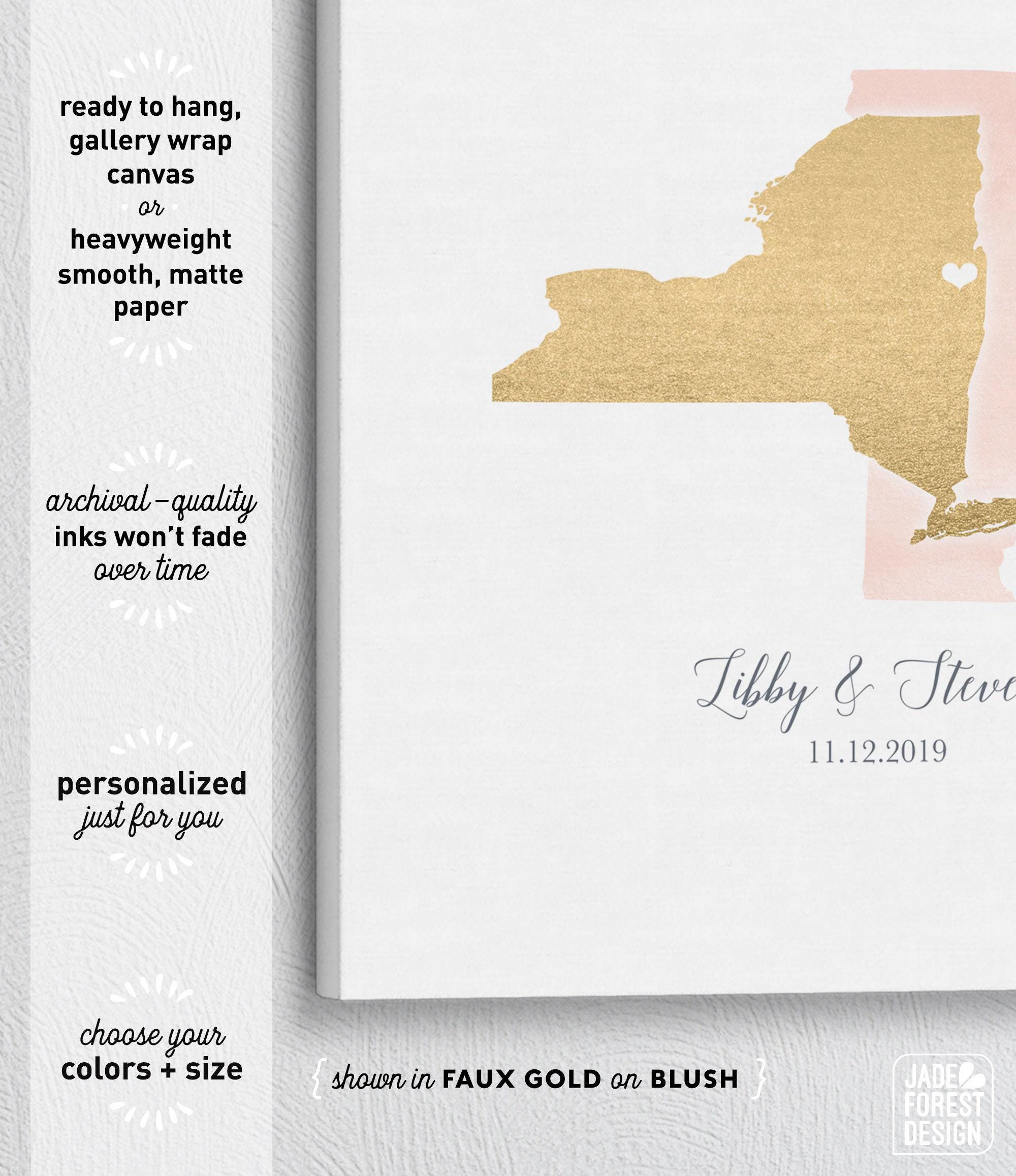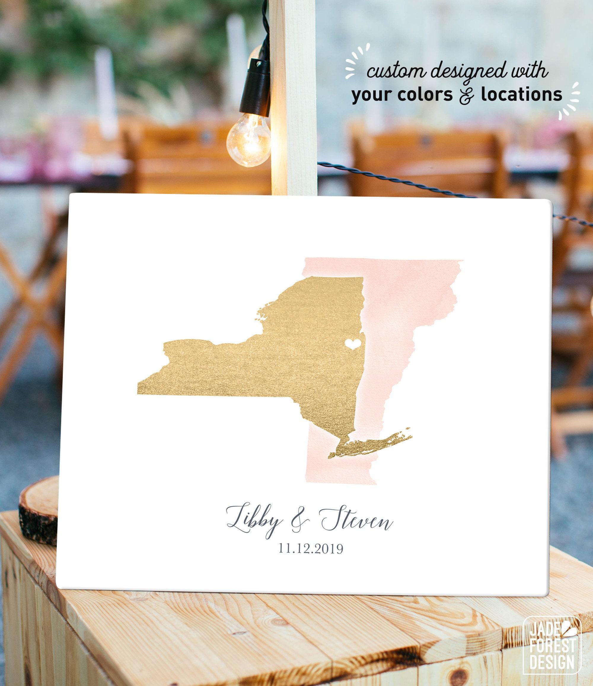 Celebrate your love story with a beautifully personalized guest book alternative that blends watercolor state art and faux metallic gold accents. This custom keepsake sign features two states or countries overlapping, marked with a heart where your cities meet, inviting guests to sign around the artwork. Perfect for couples seeking a wedding guest book that doubles as meaningful personalized map art.