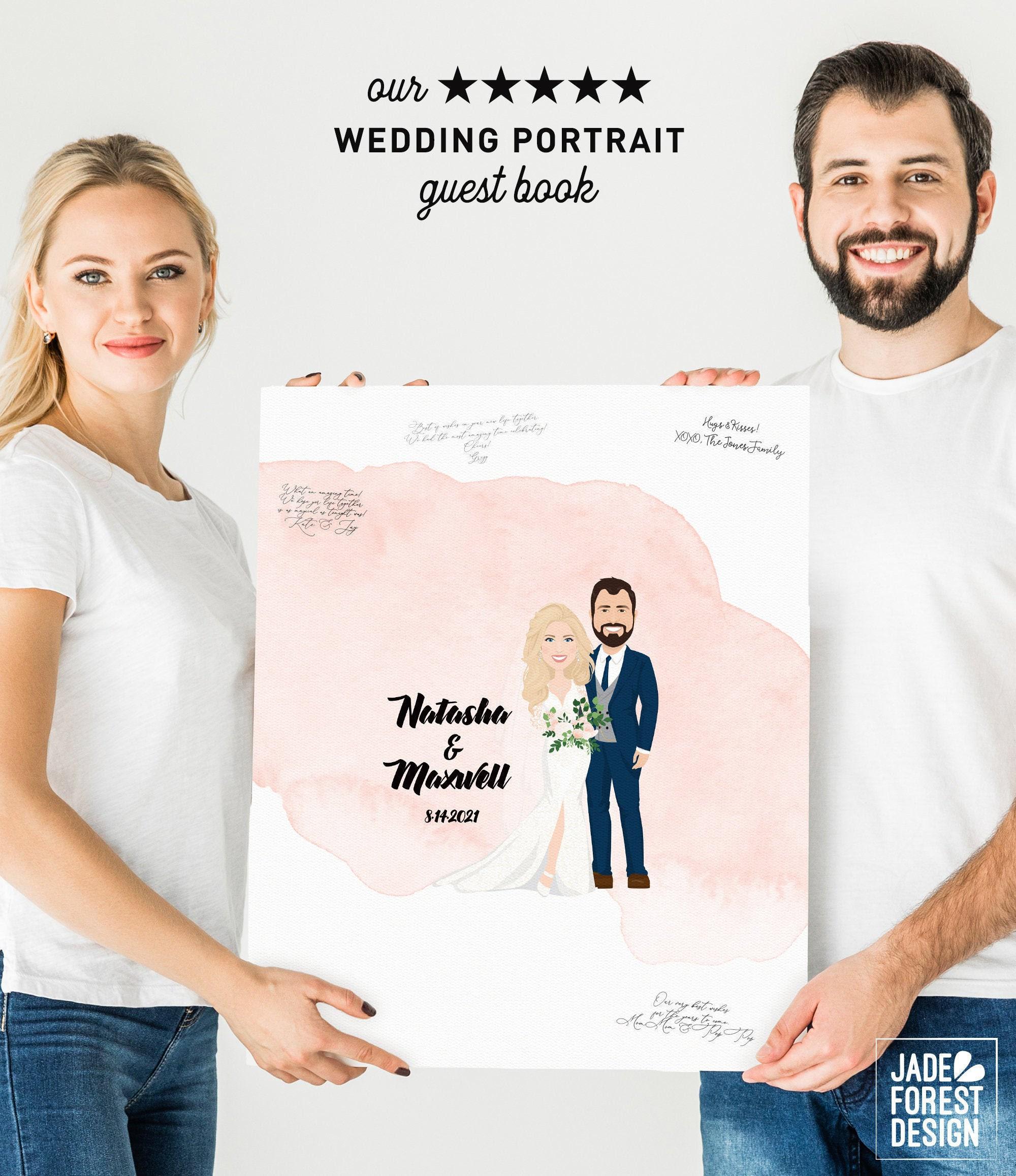 Celebrate your special day with a unique wedding guest book that your guests will love to sign! This custom couple portrait offers a charming book alternative art experience, featuring a personalized watercolor illustration of you and your partner, complete with the option to include pets or favorite accessories. Designed as an XL framed guestbook, it creates a beautiful keepsake that captures the joy of your newlywed moments in a fun and whimsical way.