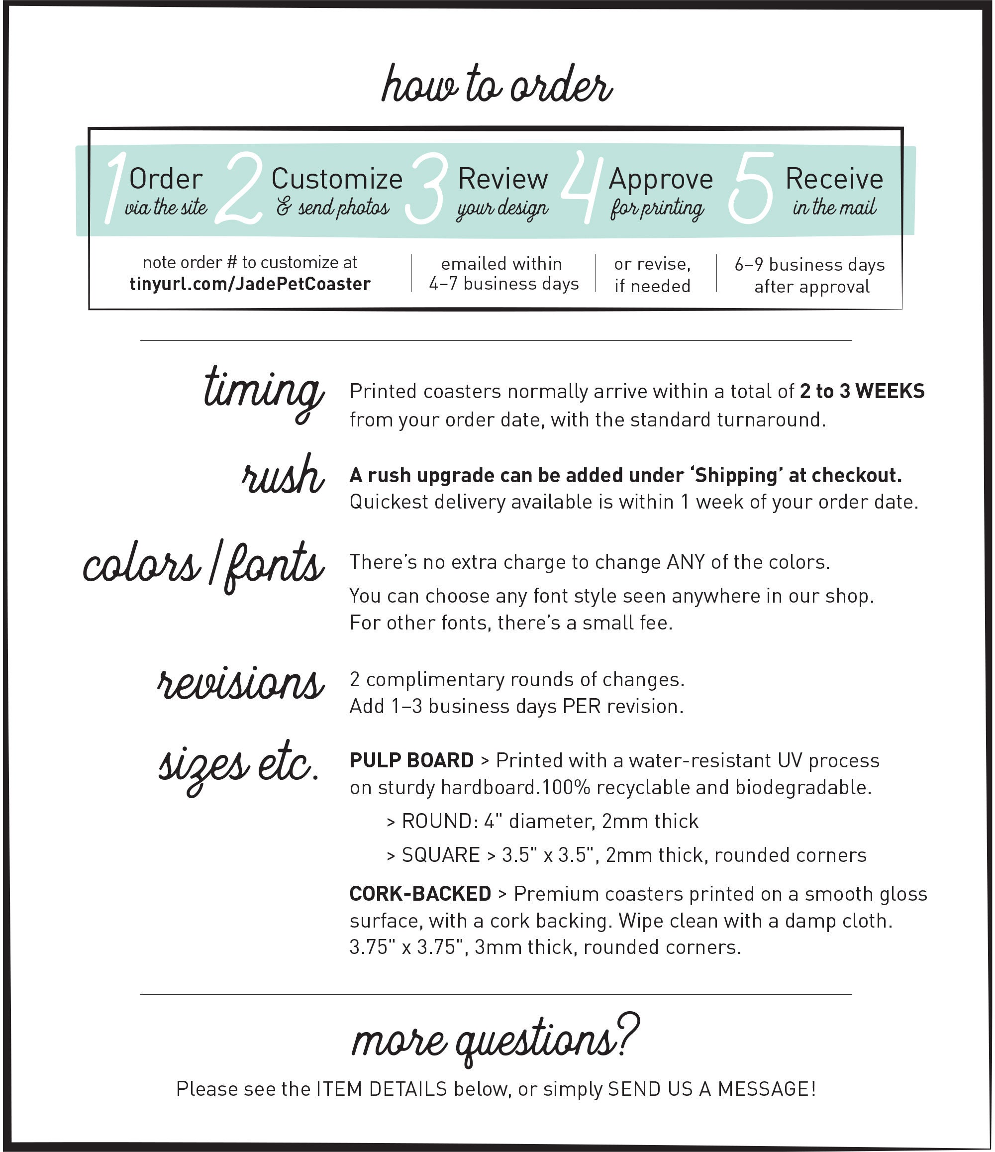 It normally takes a total of 2–4 WEEKS for your coasters to arrive in the mail with the standard turnaround: