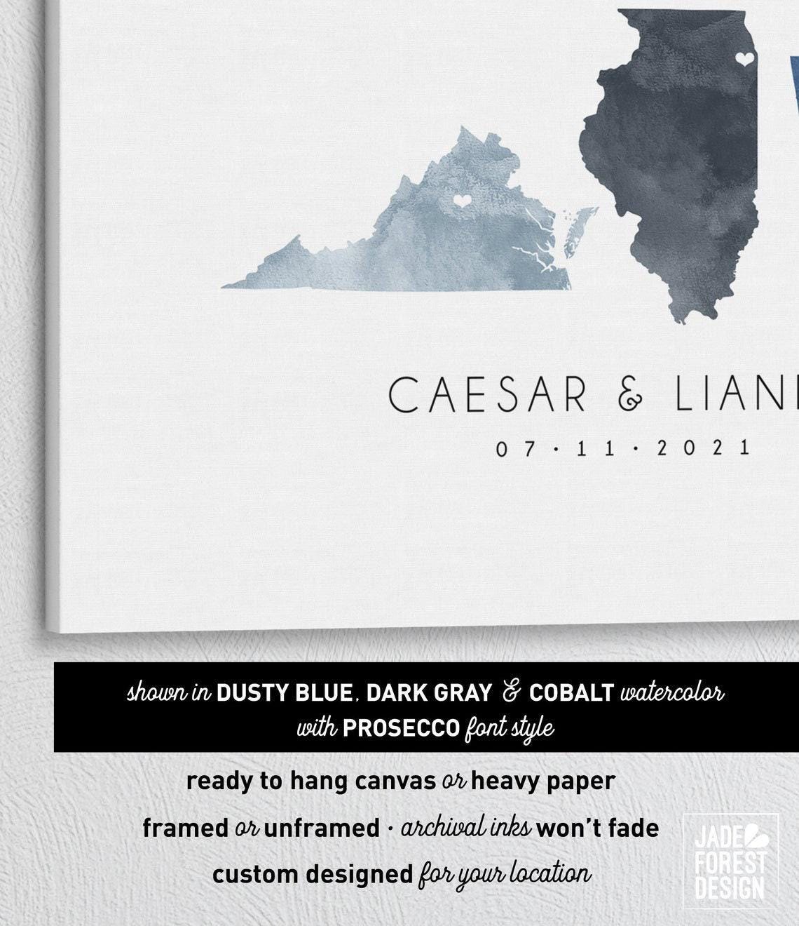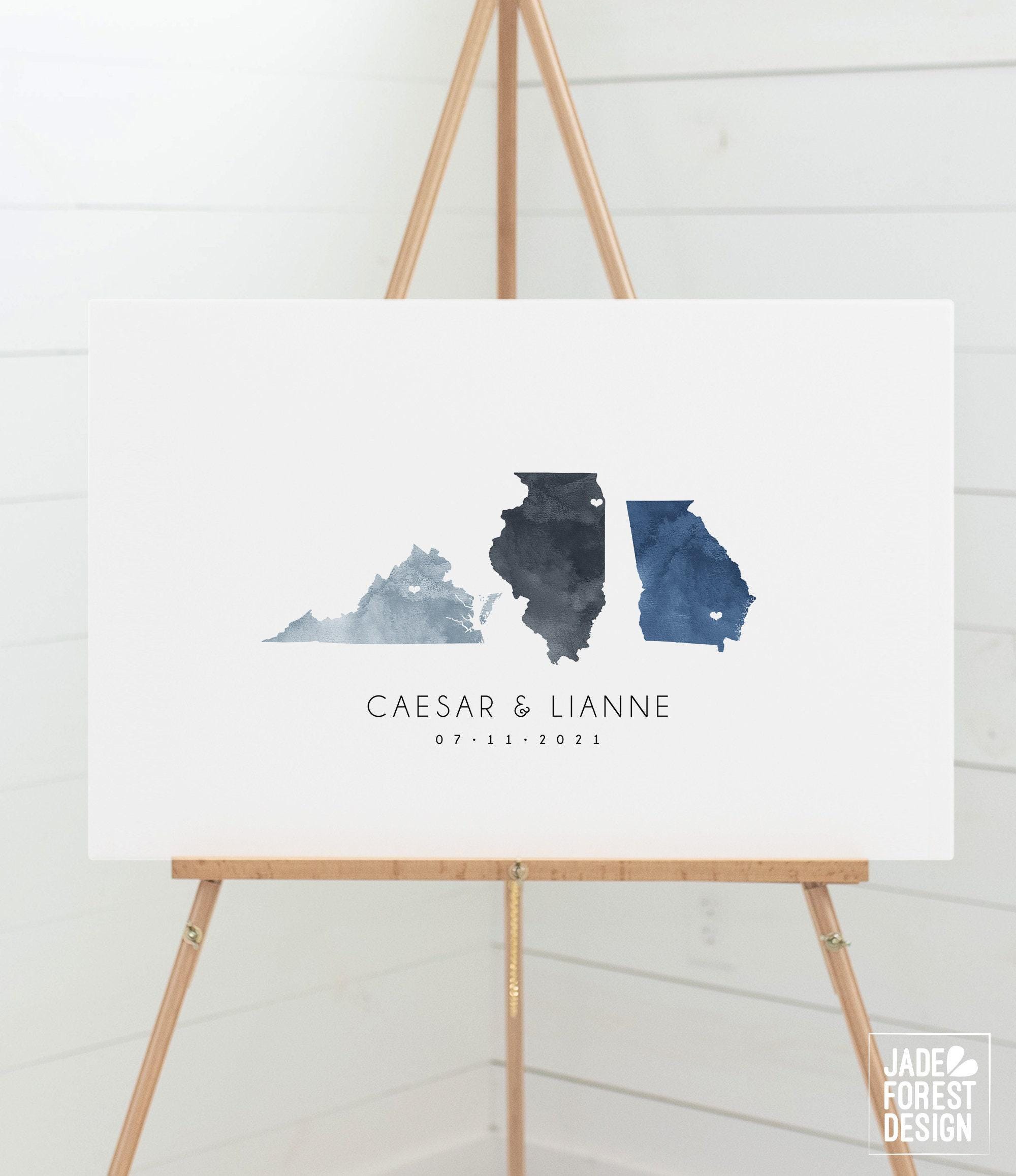 Our CUSTOM LOVE MAP guest book will tell your unique love story. It features your choice of states o countries, done in a beautiful watercolor effect, marked with hearts over your cities. The artwork will be completely customized with your locations and colors.