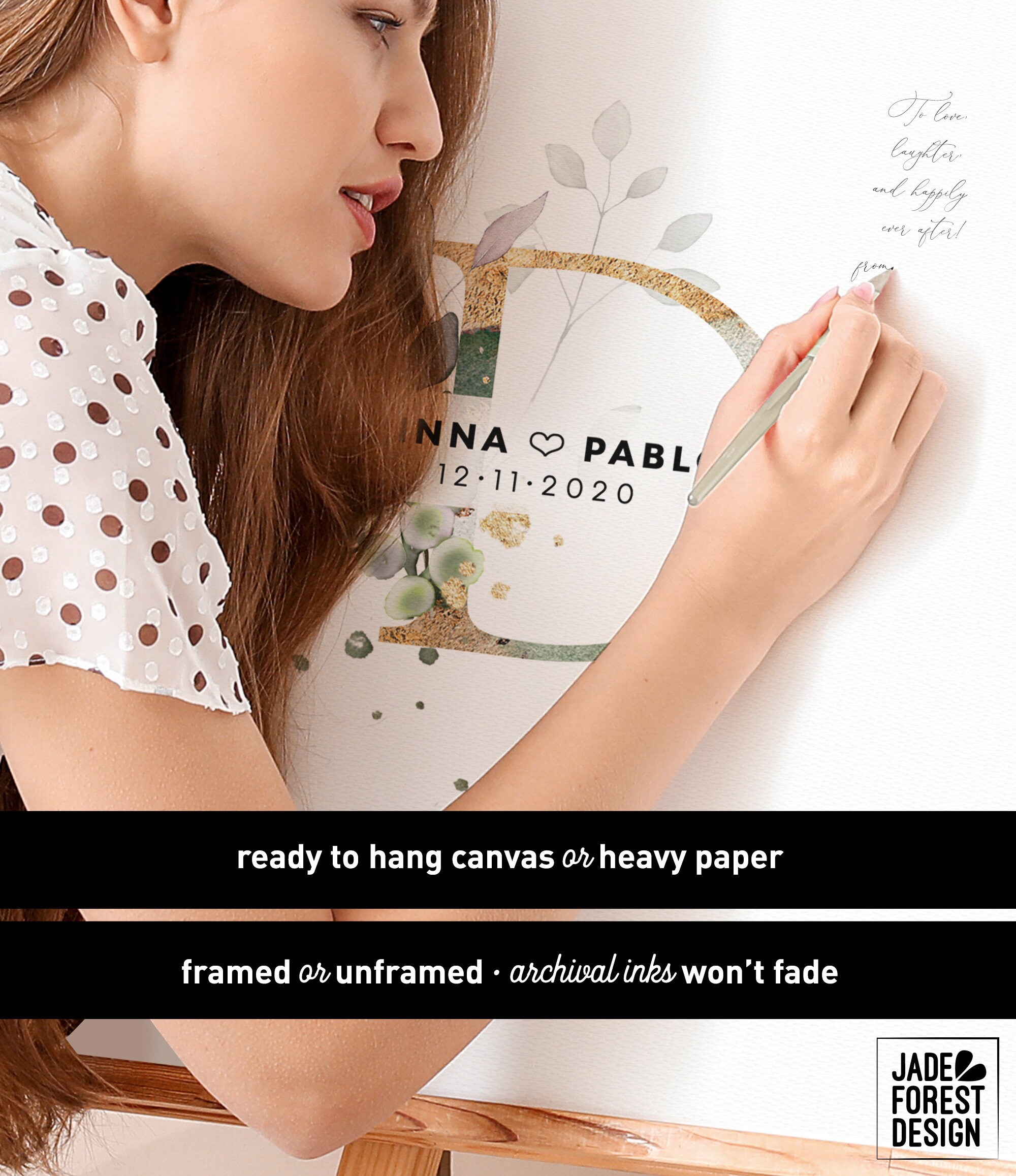 PENS ➜ I recommend providing your guests with ARCHIVAL-quality pens (such as Sakura/Micron). You should be able to find those at a craft store such as Michael’s, or on Amazon. I do not recommend Sharpies, or any other non-archival pens, as they may fade over time. Please keep in mind that you’ll need a light-colored and/or metallic pen if your signature spots are dark.