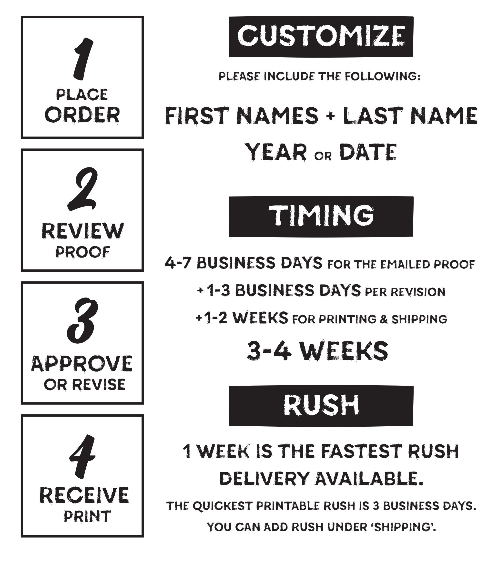 Most items in our shop have the option to choose a "printable", or "email file only", if you prefer to print locally. While we highly recommend the professional printing services offered via the shop, choosing this option means you'll receive personalized, high-resolution, printer-ready (printable) files via email. Please see "CURRENT TIMING" above for how soon to expect the emailed designs.