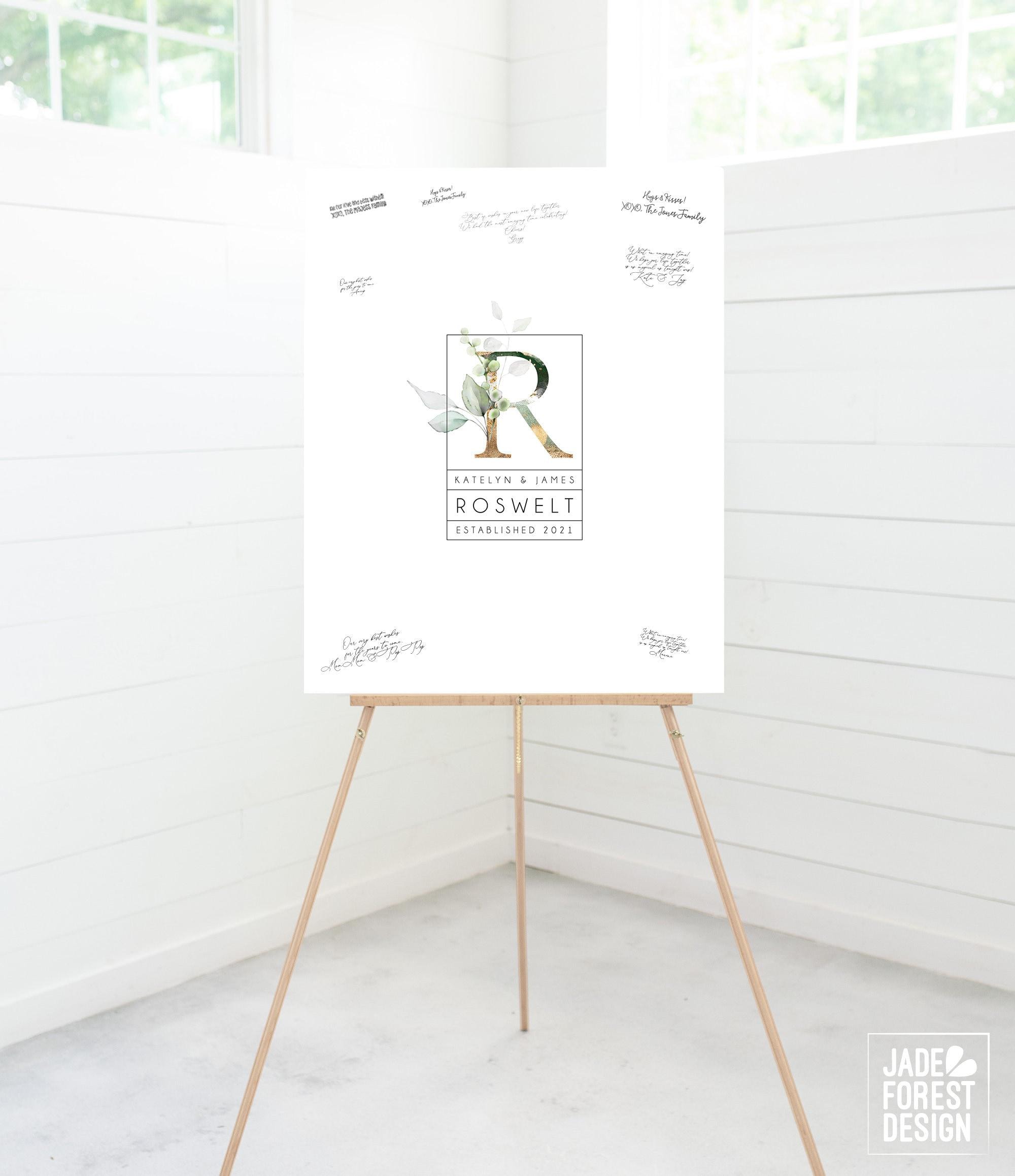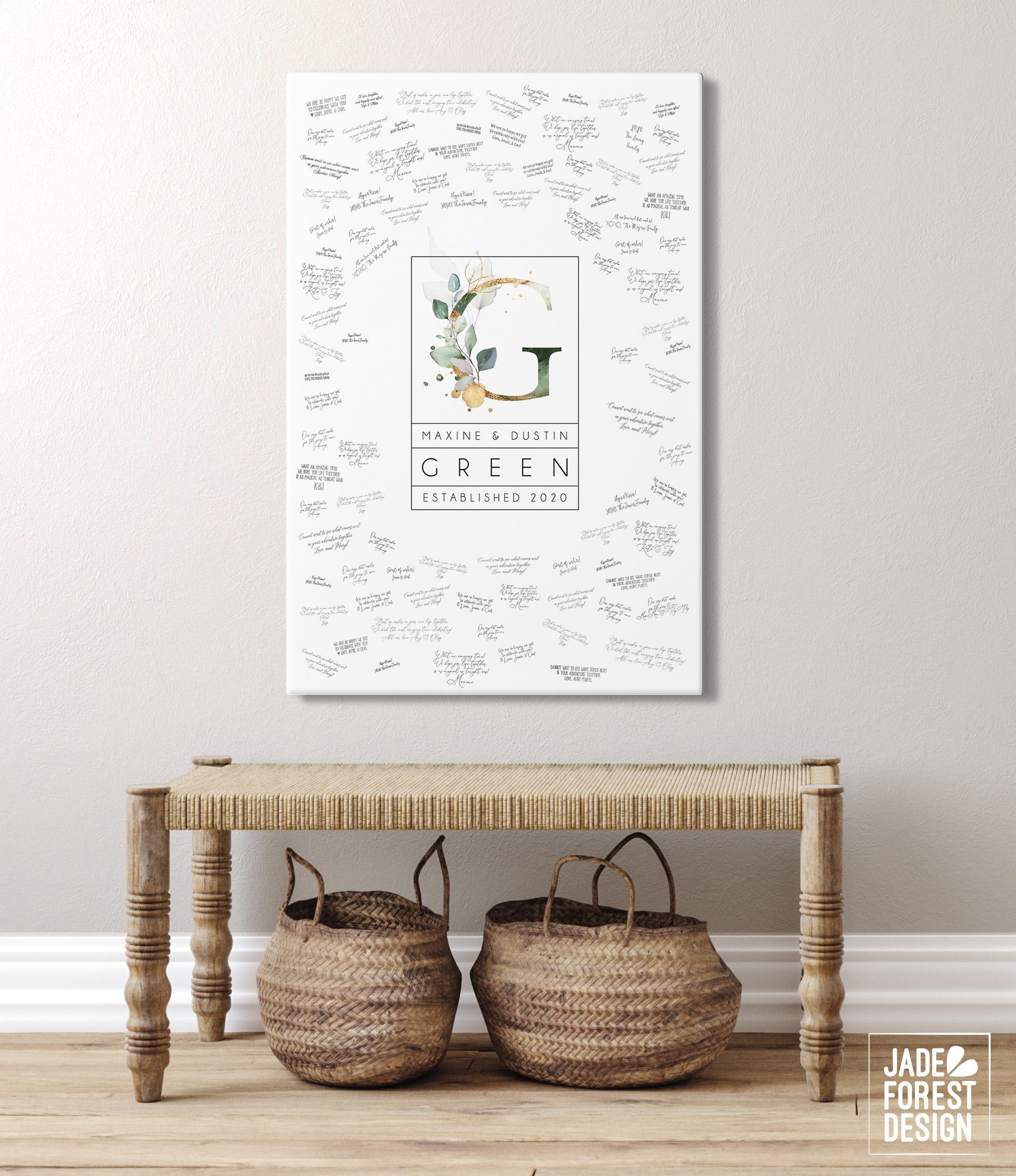 Celebrate your special day with a unique wedding guest book alternative that beautifully blends greenery and gold accents with a custom monogram. This large framed canvas invites your guests to leave heartfelt messages, creating a cherished keepsake that reflects your personal style. Designed to complement elegant wedding decor, this guestbook offers a sophisticated touch with its faux metallic gold initial and personalized last name.