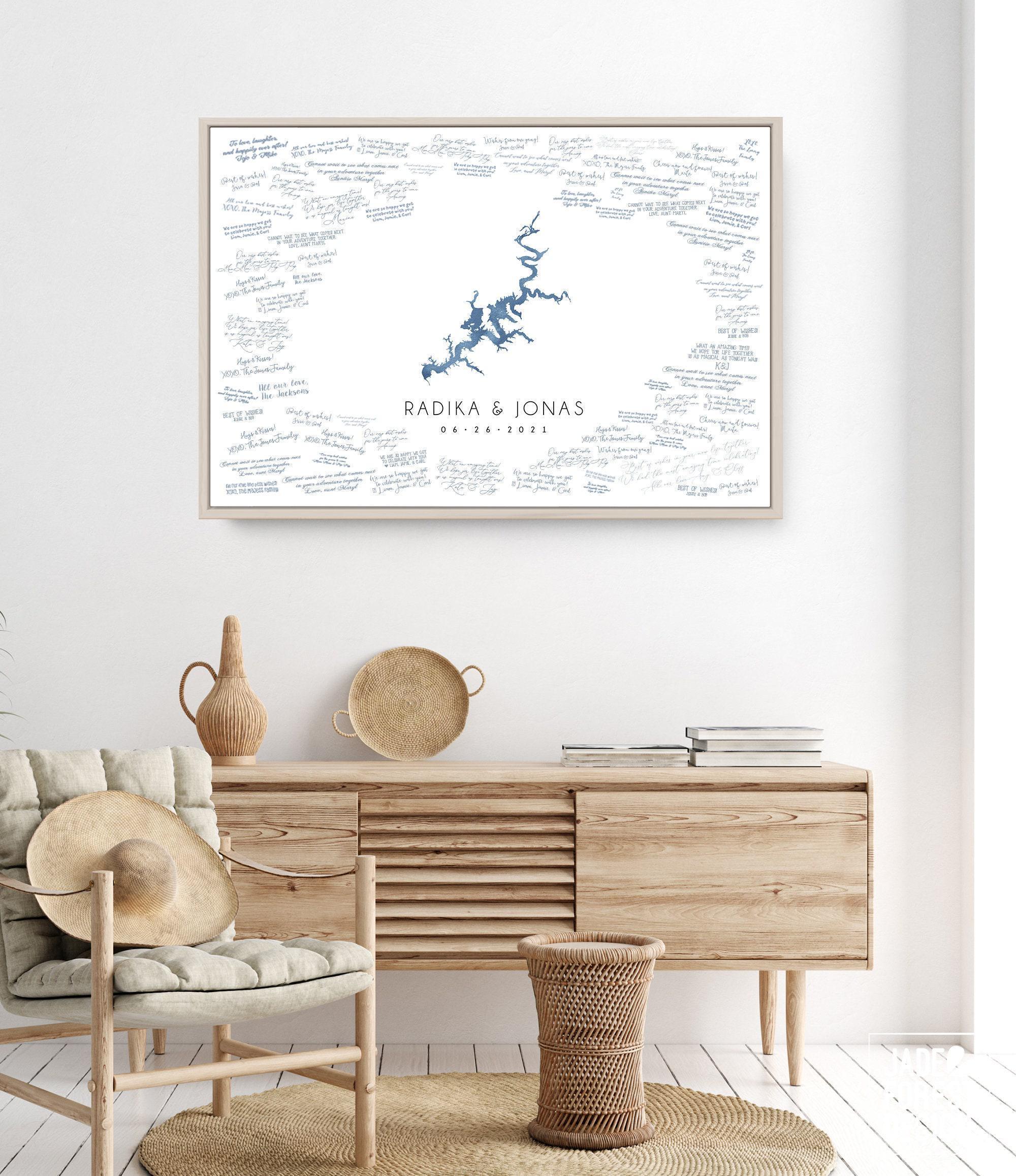 Celebrate your special day with a unique wedding guest book alternative that captures the spirit of your lakeside celebration. This custom lake map guest book features a stunning dusty blue watercolor art design, perfect for an outdoor wedding by Lake Tahoe or any cherished lake. Crafted as a personalized keepsake sign, it invites guests to leave heartfelt messages around a beautifully rendered map, blending art and memory seamlessly.